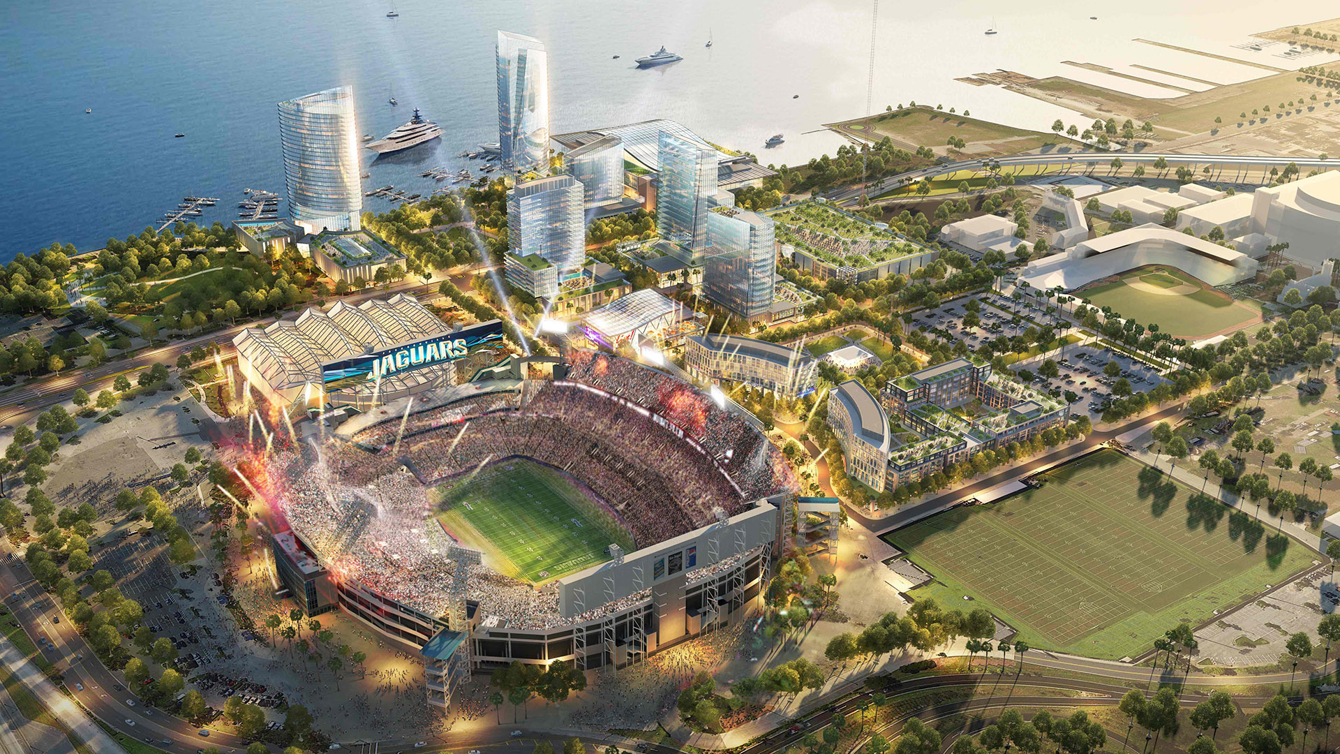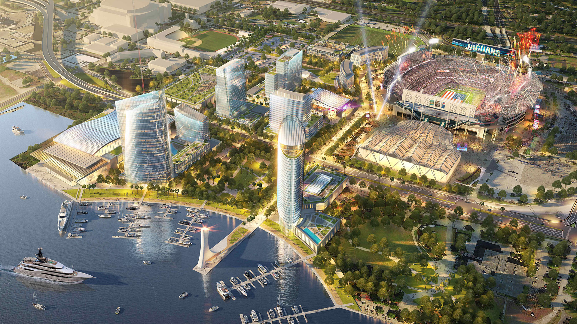 In partnership with the Jacksonville Jaguars and Iguana Investments, a $2.5 billion world-class, mixed-use district will surround the downtown Jacksonville Shipyards. The development will create a vibrant neighborhood dedicated to bringing first-class amenities and experiences together 365 days a year just feet away from TIAA Bank Field, Daily’s Place, Veterans Memorial Arena and the Baseball Grounds of Jacksonville. The master development plan spans 4.25 million square feet of best-in-class dining, entertainment, retail, office, hotels and luxury residential living.